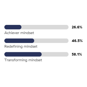 Their results were further split by their Leadership Mindset to explore differences between these mindsets. Only Achieving, Redefining, and Transforming were retained, as other mindsets were too few for an appropriate analysis.